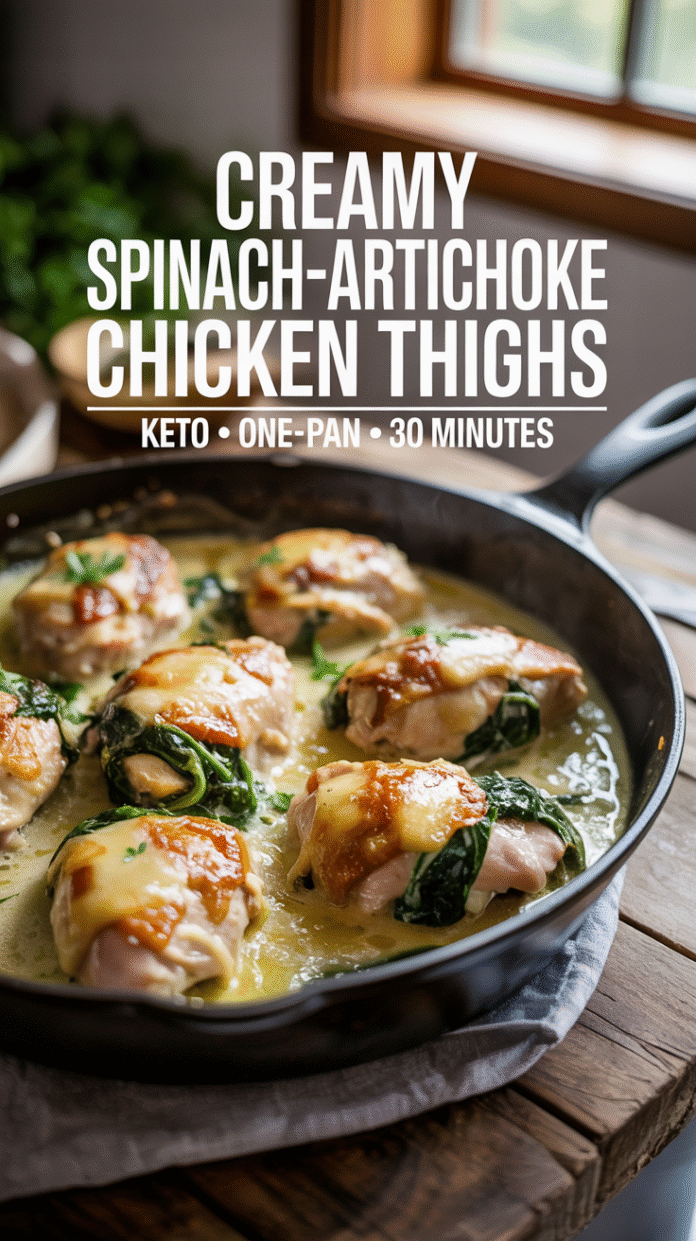 All the flavors of spinach–artichoke dip smothered over juicy chicken thighs in a bubbly, cheesy skillet. This one-pan keto dinner is weeknight-easy, ready in about 30 minutes, and guaranteed to be a family favorite.