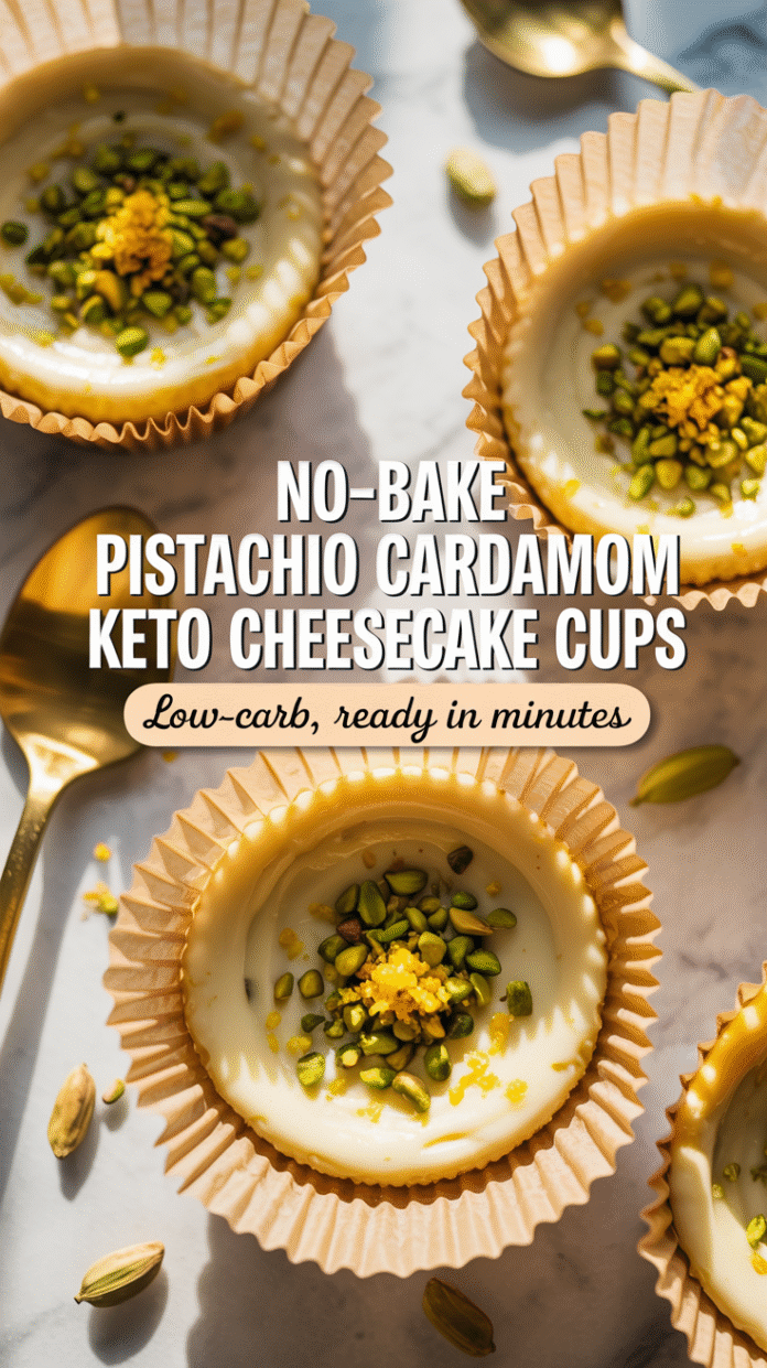 These no-bake pistachio cardamom keto cheesecake cups are silky, spiced, and irresistibly creamy. A buttery almond flour base is topped with a cloud-like cheesecake filling, warm cardamom, and a pistachio crunch—perfect for effortless entertaining or make-ahead treats.