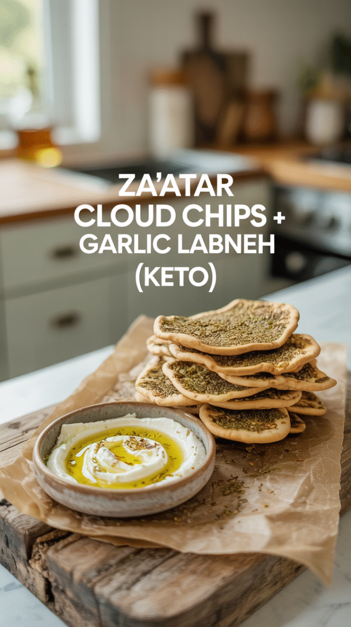 These za’atar cloud bread chips are light, crisp, and wildly snackable—paired with a silky garlic labneh dip for a Mediterranean twist. Bake them in the oven or pop them in the air fryer for a keto, gluten-free bite that’s ready in about 20 minutes. Category: Snack | Difficulty: Easy | Season: All-season.